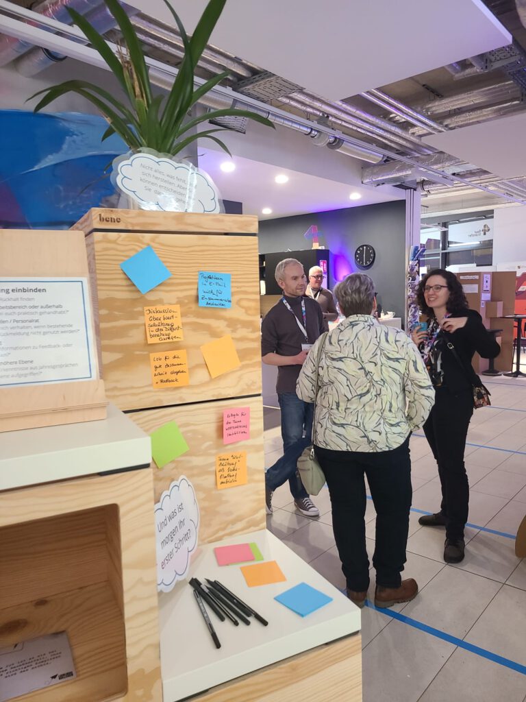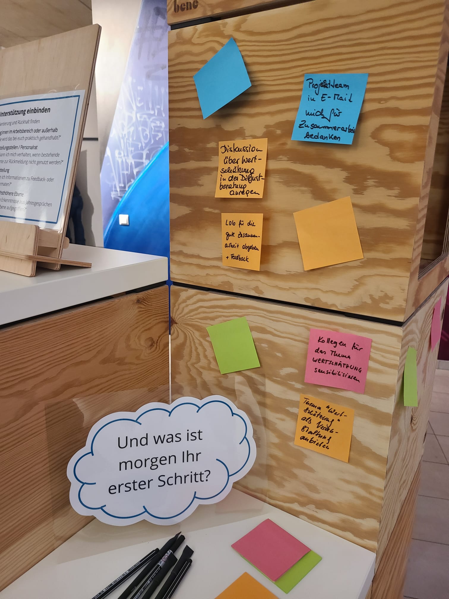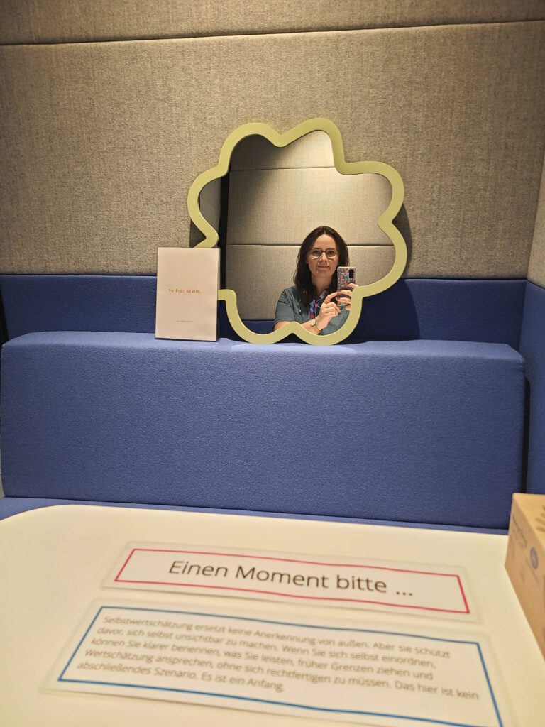 Diskutiert wurde, wo Wertschätzung verloren geht, warum sie im Alltag oft untergeht und wie sie jenseits formaler Instrumente wahrgenommen wird. Im Fokus standen Rückmeldung im Projektalltag, Jahres- und Mitarbeitergespräche, aber auch kleine, informelle Gesten, die Wirkung entfalten können. Ein besonderer Ort war die Kabine zur Selbstwertschätzung: ein kurzer Moment des Innehaltens, um die eigene Arbeit einzuordnen und anzuerkennen. Kein Rückzug, sondern ein bewusster Startpunkt für weitere Gespräche und Austausch.