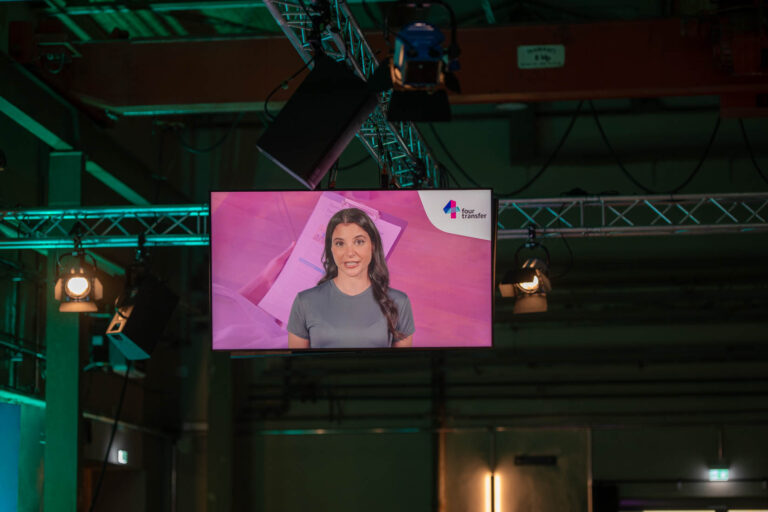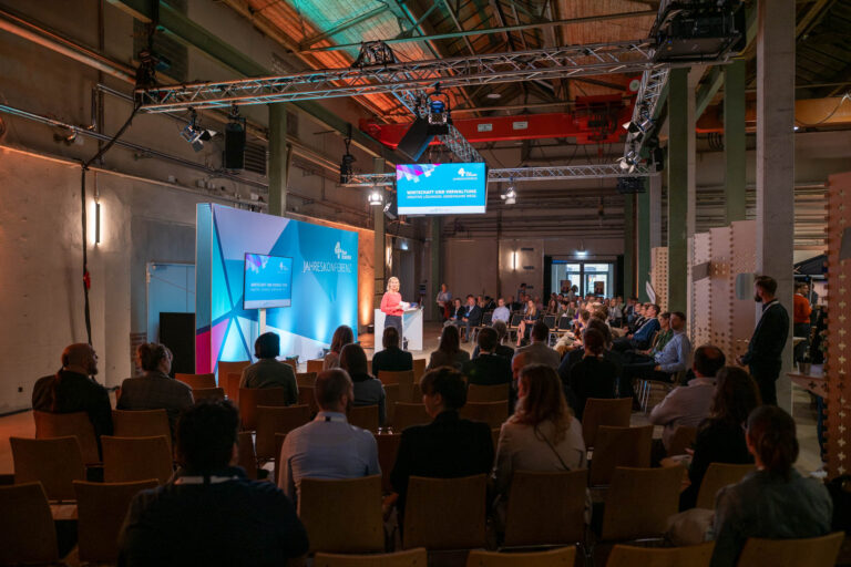 Als Motto für die diesjährige Jahreskonferenz, bei der wir viele neue Besucher:innen, aber auch eine Menge bekannter Gesichter begrüßen konnten, haben wir uns ganz bewusst für »Wirtschaft und Verwaltung: kreative Lösungen. Gemeinsame Wege.« entschieden. Der Fokus lag hierbei auf technischen Innovationen, co-kreativen Lösungsfindungsprozessen, kommunikativem Austausch und übergreifenden Synergien. Unter diesen Vorzeichen haben wir uns der Frage gewidmet, wie Methoden und Ansätze der Kultur- und Kreativwirtschaft Transferaktivitäten inspirieren und wie Transfer zwischen Wirtschaft und Verwaltung noch besser gelingen kann. Hierfür wurde ein vielfältiges Programm kreiert, das unter anderem motivierende Keynotes, spannende Diskussionen, vier intensive Sessions und einen inspirierenden musikalischen Soundtrack beinhaltete, für den wir uns gleich vorab ganz herzlich bei Pony Pracht bedanken, die gezeigt hat, wie KI-gestützte Musik aussehen und sich anhören kann.